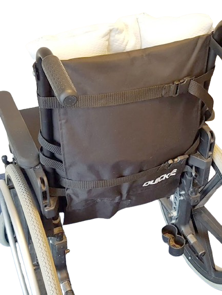 Rugkussen met kliksluitingen die in verschillende stoelen bevestigd kan worden; rolstoel, fauteuil, autostoel etc. Door de kliksluitingen en banden verplaatst het rugkussen niet.